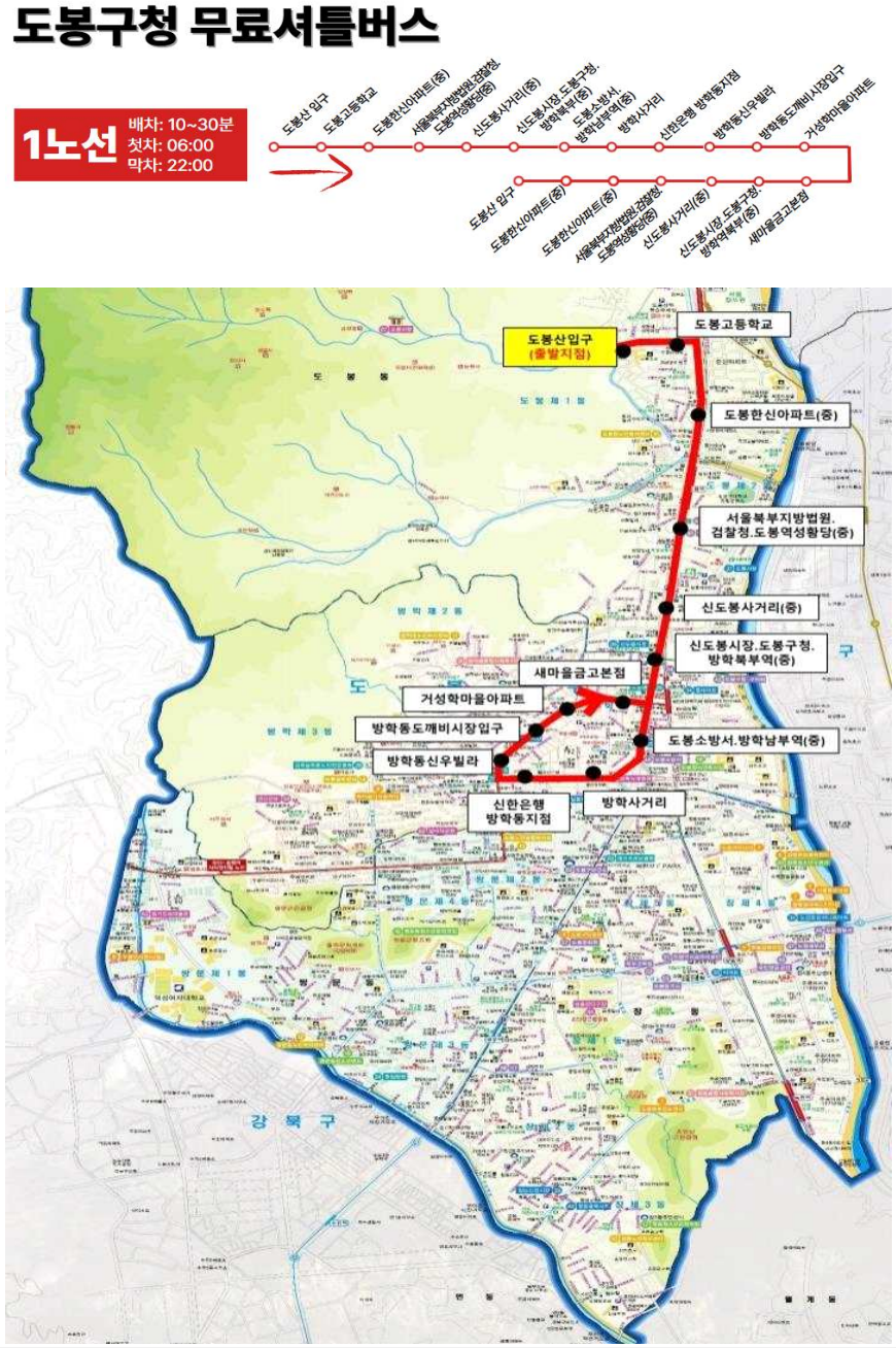 | 1 | 도봉산입구↔도봉역↔방학북부역↔방학남부역↔도깨비시장 | 10~30분 |