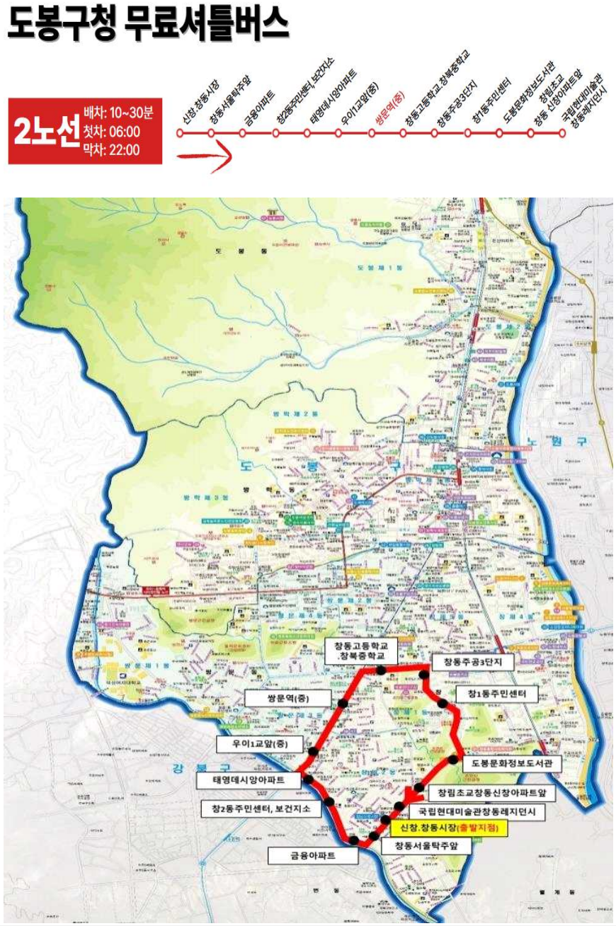 | 2 | 신창.창동시장↔태영아파트↔쌍문역↔주공3단지↔도봉문화정보도서관 | 10~30분 |