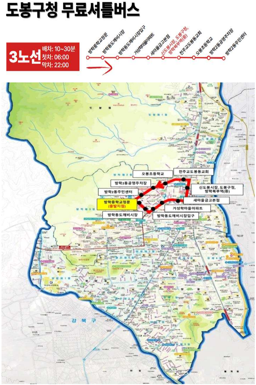 | 3 | 방학증학교정문↔도깨비시장↔거성학마을↔방학북부역 | 10~30분 |