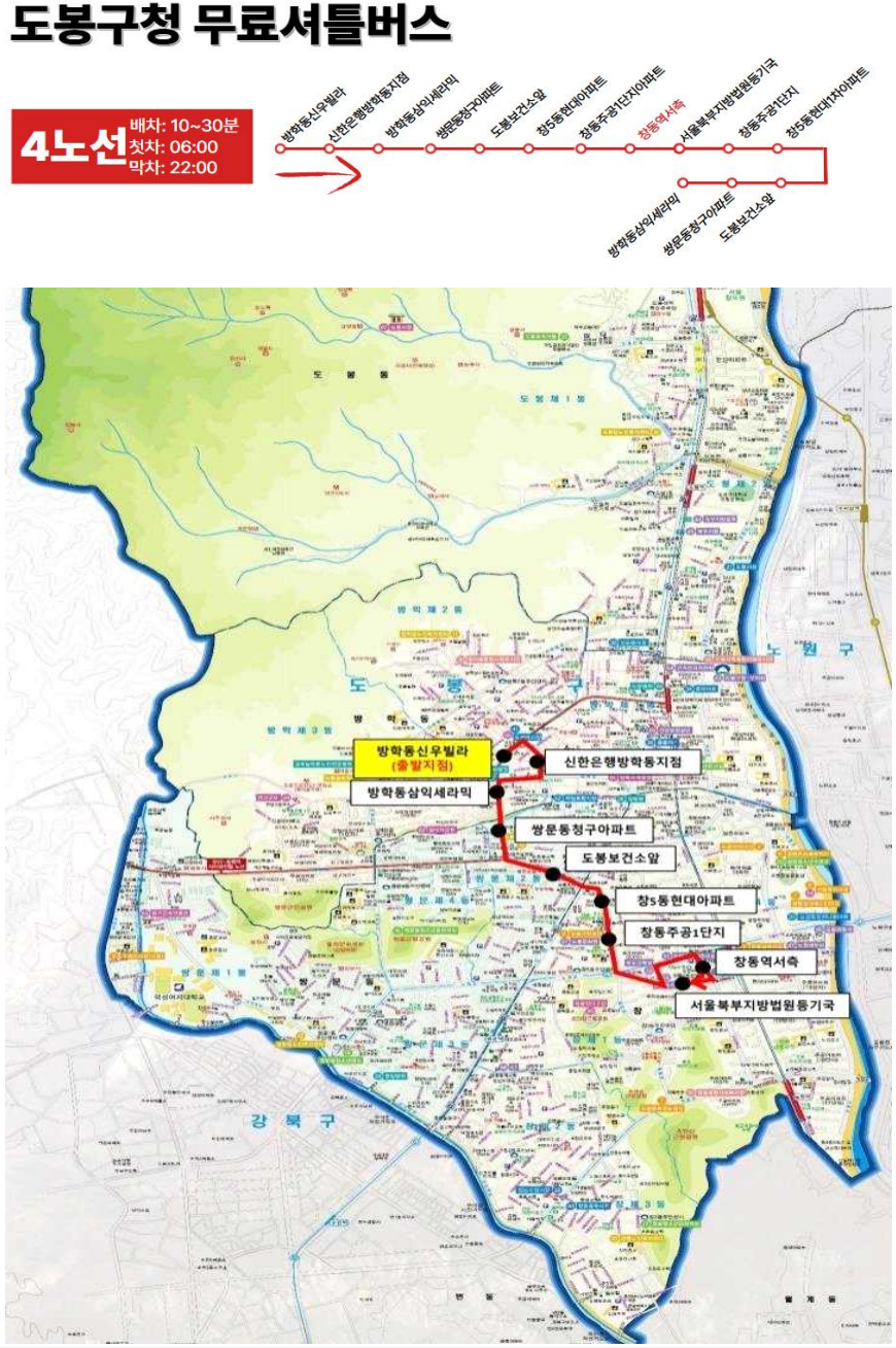 | 4 | 방학동신우빌라↔청구아파트↔주공1단지↔창동역 | 10~30분 |
