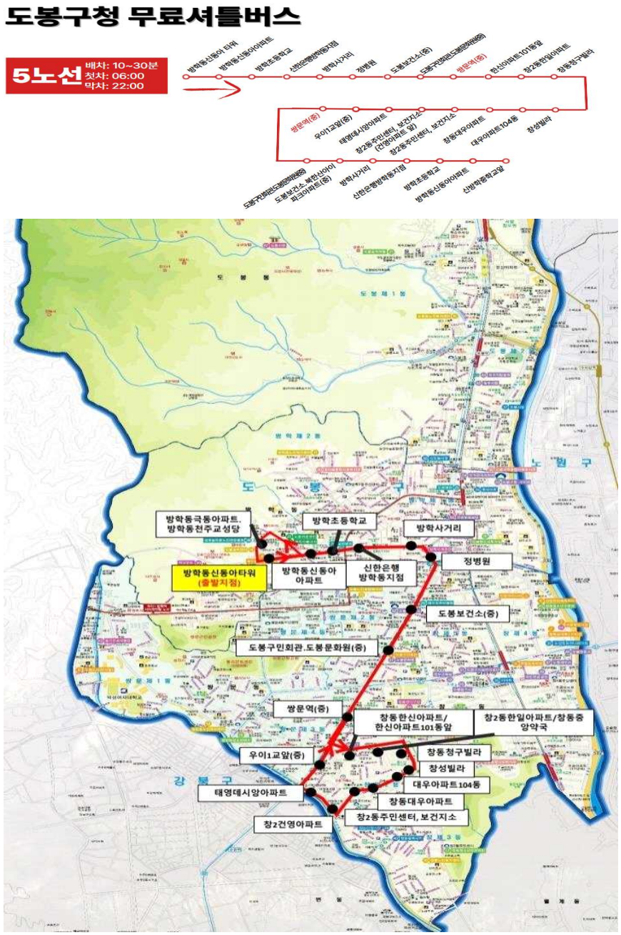 | 5 | 방학동신동아타워↔방학사거리↔도봉구민회관↔쌍문역 | 10~30분 |